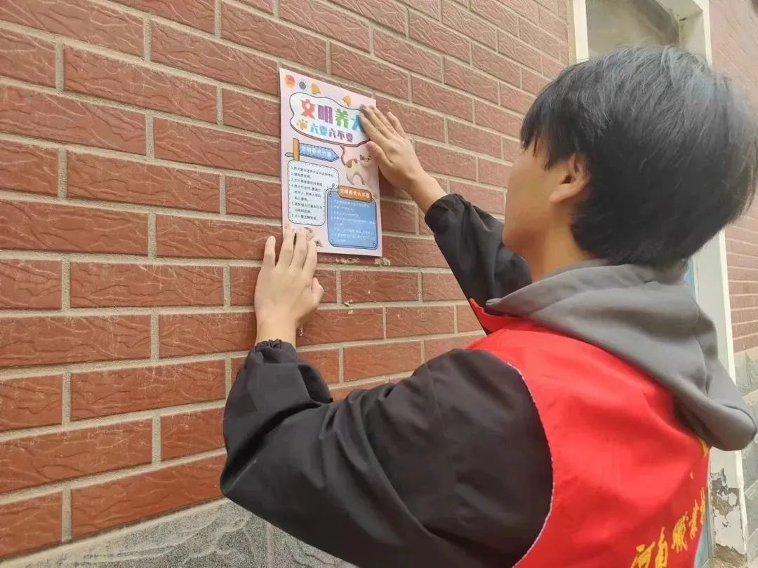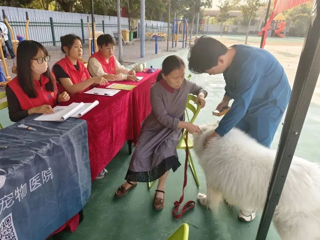 活动中,青年志愿者们在小区单元门口张贴了标有文明养犬标识的宣传页和社区安全员微信的二维码,他们还向社区居民普及养犬相关的法律规定,包括在溜狗时严格佩戴狗绳,及时办理犬证、集中注射疫苗等事项;同时,文苑社区工作人员还联系了宠物医院的青年医师带着专业设备在小区游乐场设点,为养犬居民现场讲解爱犬常见的疾病及预防知识,并为现场的宠物进行了基础检查。