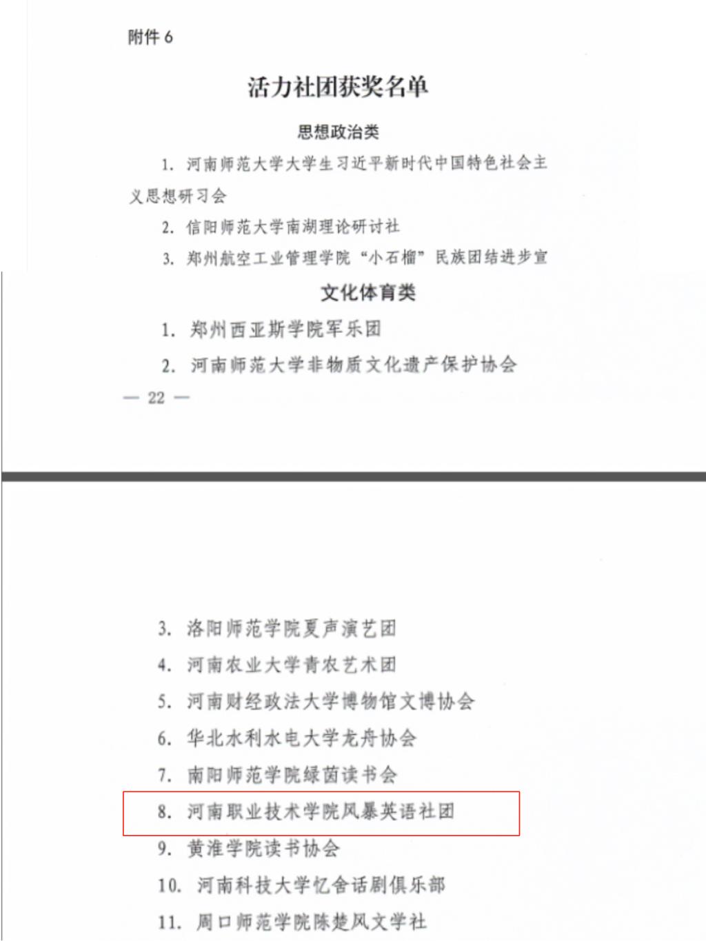 近期,由共青团河南省委主办的2023年度“活力杯”河南高校共青团基层基础工作大赛结果公布,王晓毅老师的“立足文化自信弘扬中国精神”荣获微团课大赛一等奖,张雯老师指导的风暴英语协会荣获文化体育类“活力社团”荣誉称号,我校荣获“优秀组织奖”。