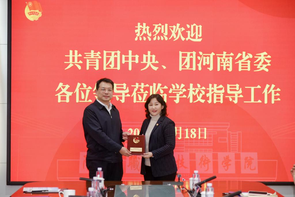 曾锐高度认可我校作为全国“双高”校的办学理念和党建带团建工作取得的成效,从“德厚、技高、务实、创新”等四个方面赞扬了近年来学校建设取得的成果,他希望学校围绕学生成长成才,继续夯实团建基础,创新活动载体,进一步发挥党建带团建的组织优势,在思想引领、科技创新、就业创业等方面发挥重要作用,进一步推动共青团工作迈出新步伐、取得新成效。同时,曾锐回顾了夏新颜挂职共青团中央少年部副部长的工作经历,感谢河南省委组织部、团河南省委对共青团中央、全国少工委工作的支持,感谢夏新颜克服困难高标准完成挂职工作。