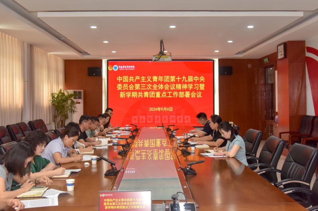 为推动学校共青团工作高质量发展,9月4日下午,我校在行政楼332会议室组织召开团十九届三中全会精神学习暨新学期共青团重点工作部署会议,集中传达学习团十九届三中全会精神,并对学校新学期共青团重点工作进行安排部署。校党委副书记、工会主席田华出席并讲话,各二级学院团总支书记及校日韩精品视频在线全体人员参会,校日韩精品视频在线副书记王璐主持会议。