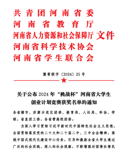 近日,由共青团河南省委、河南省教育厅、河南省人力资源和社会保障厅、河南省科学技术协会、河南省学生联合会共同主办的2024年“挑战杯”河南省大学生创业计划竞赛决赛评审结果公布。我校共获奖32项,其中金奖9项,银奖5项,铜奖17项,38名教师获评“优秀指导教师”称号,我校荣获“优胜杯”,综合成绩再创新高!