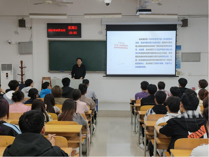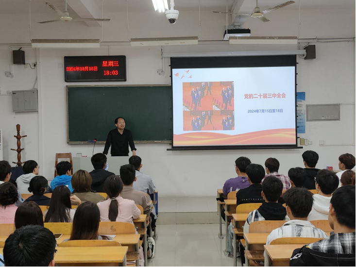 宣讲中,曾凤括围绕三个方面深入阐述了党的二十届三中全会精神:首先,他介绍了党的二十届三中全会召开的时代背景,接着,他深入讲解了党的二十届三中全会主要内容及精神内核,并为大家详细解读了党的二十届三中全会通过的《中共中央关于进一步全面深化改革、推进中国式现代化的决定》,要求大家自觉把思想和行动统一到习近平总书记重要讲话精神和全会部署上来,紧扣“以中国式现代化全面推进强国建设、民族复兴伟业”这一新时代最大的政治,切实推动全会精神在学校落地生根。最后,他强调大家身为新时代青年,要勇于担当历史使命,积极投身到全面深化改革和现代化建设的伟大事业中去。