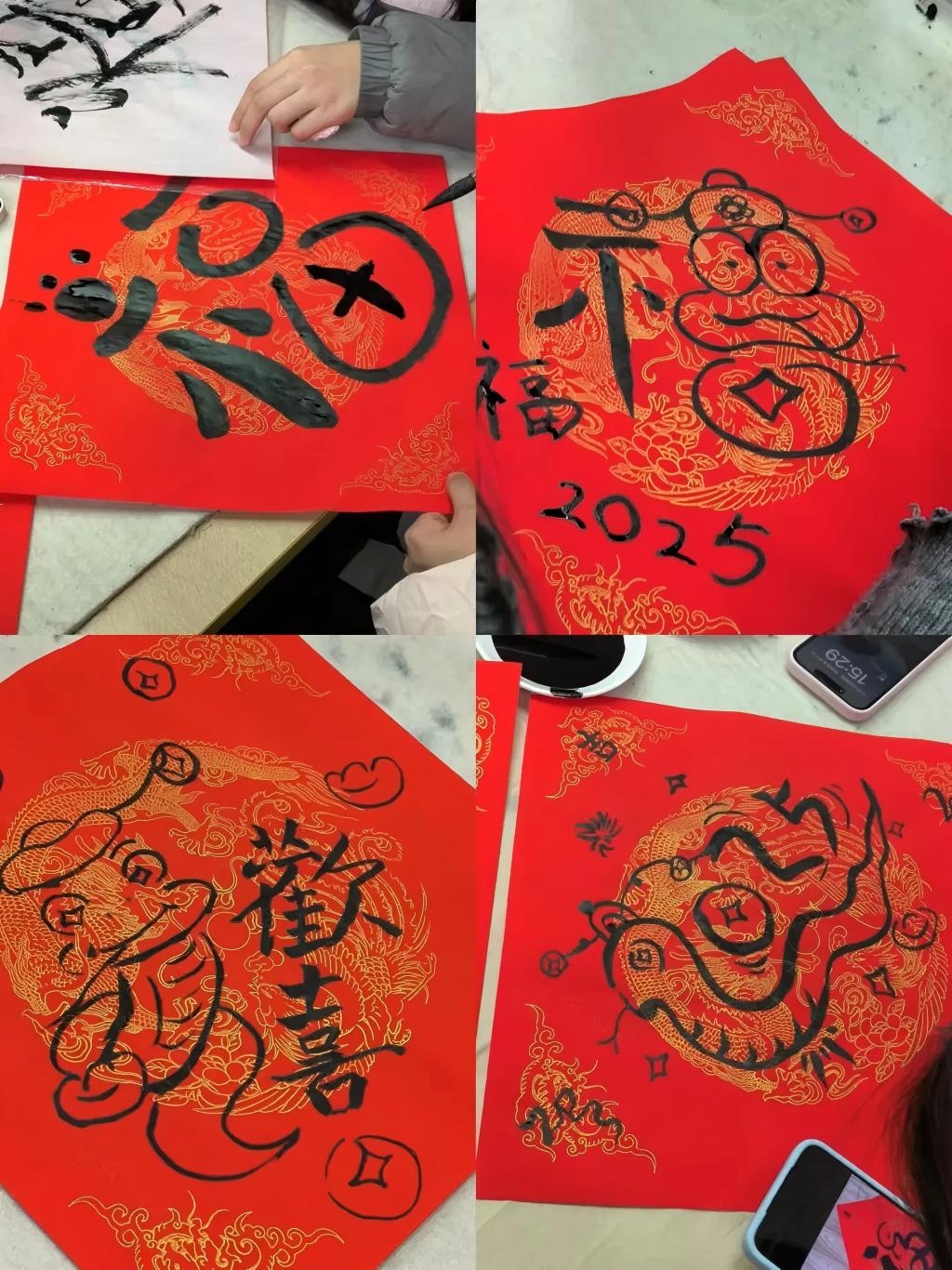 活动现场洋溢着一片热烈而欢快的氛围,新星书画社的社员们精心展示的春联作品,涵盖了楷书之端庄、篆书之古朴、隶书之典雅等多种风格,宛如一幅幅生动的文化画卷,深深吸引了众多师生的驻足观赏与积极参与。师生们流连于琳琅满目的对联与方格福之间,细心挑选着心仪之作,整个场景弥漫着浓厚的节日气息,仿佛提前迎来了新春的喜庆与温馨。