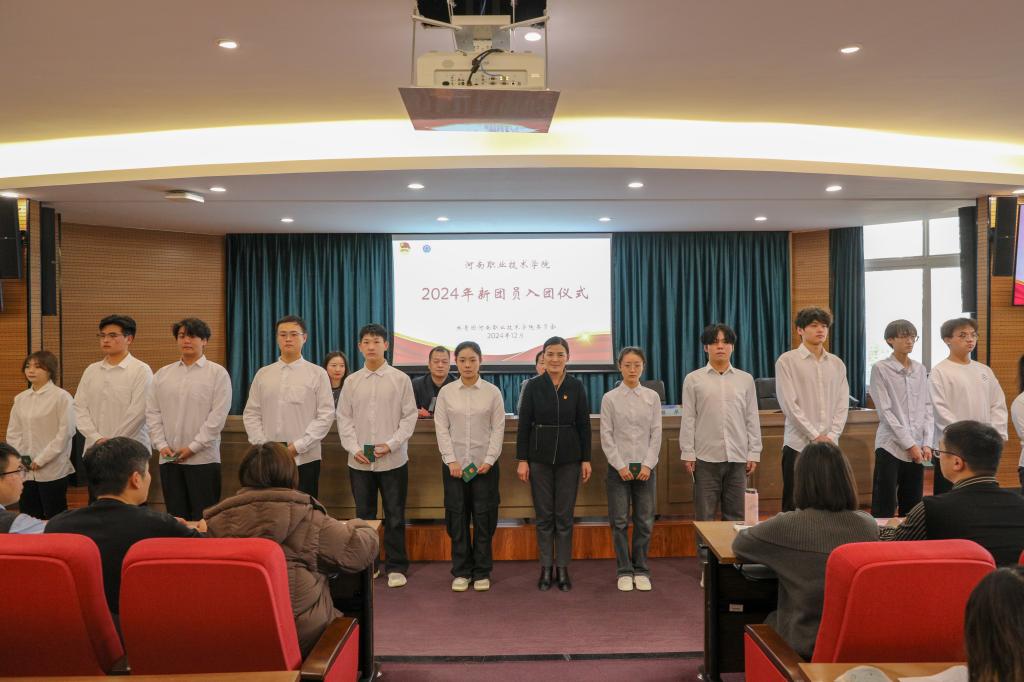 仪式上,王璐宣读了2024年下半年新发展团员名单。杨华、宋东方为新团员代表颁发团员证并佩戴团徽。学生代表崔保全带领全体新团员进行宣誓。新老团员代表邹欣晨、张思彤分别进行了发言,立志以一名优秀团员的标准严格要求自己,发挥模范带头作用,为团组织增光添彩。