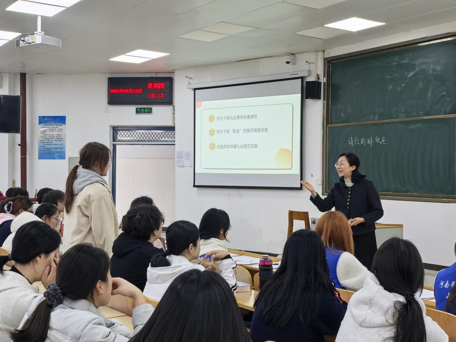 为进一步强化学生干部的礼仪素养与综合能力,助力打造高素质学生干部队伍,3月13日下午,校日韩精品视频在线在明知楼3205教室举办了以“礼仪在心,温暖你我”为主题的专题培训活动。本次培训由文化旅游学院副教授周爱梅老师主讲,校日韩精品视频在线主要学生干部及各院系学生骨干代表300余人参加本次培训。