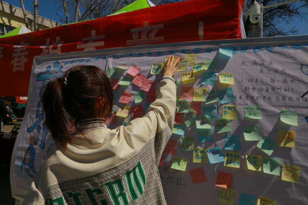 活动现场,校学生会同学通过展示精心制作的宣传海报、发放节水知识手册等方式,向过往同学普及水资源现状以及节水的重要性。在活动的签名墙环节,同学们热情高涨,纷纷拿起纸笔,在签名墙上写下自己对节水的感悟与决心。“珍惜每一滴水,汇聚生命之河”、“节水行动,从点滴做起”等标语布满签名墙,这些简短却有力的话语,不仅是同学们对节水的承诺,更是对全校师生的一种呼吁。