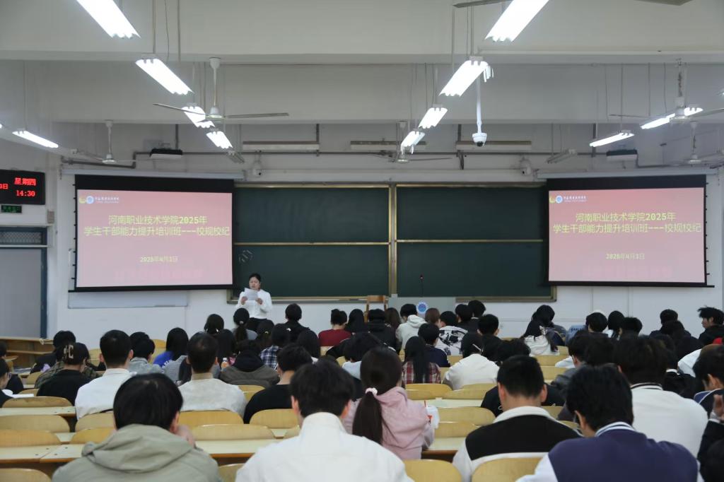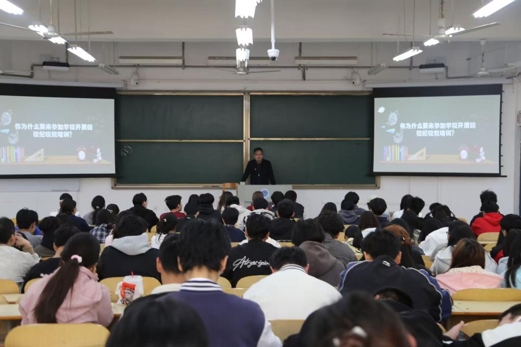 为加强学生干部队伍建设,提升学生干部的校规校纪意识和综合素质,4月3日下午,校日韩精品视频在线在明理楼1101教室举办了学生干部校规校纪教育专题培训。本次培训由学校党委学生工作部(学生处、武装部)学生管理科科长周春雷主讲,校日韩精品视频在线主要学生干部及各二级学院学生代表300余人参加本次培训。