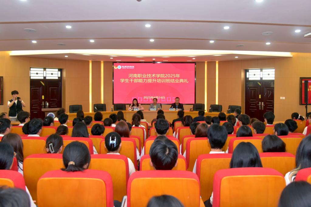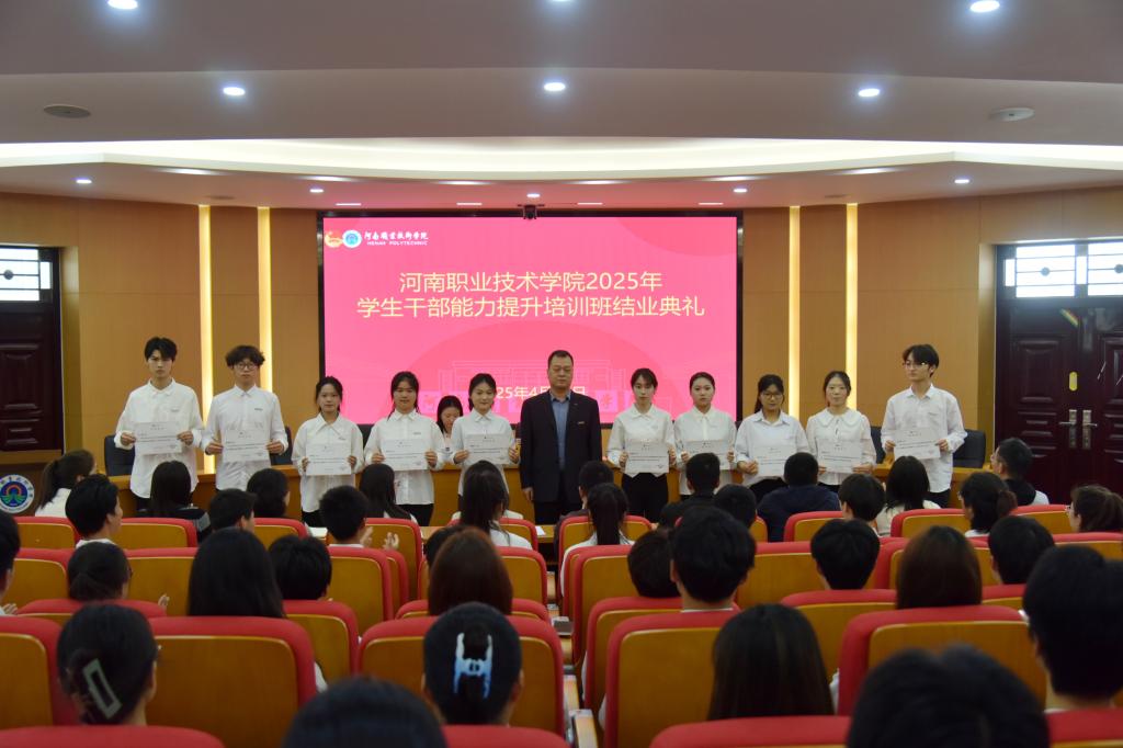 典礼上,校党委副书记、工会主席田华充分肯定了学生干部能力提升培训班的效果,并向学生干部提出了三点希望和要求:一是坚定信念,做政治过硬的“领航者”。学生干部的第一身份是“学生”,应成为思想的引领者。希望大家始终牢记“为同学服务”的宗旨,以德为先、做青春正能量的传播者。二是知行合一,做躬身实践的“行动派”。坚持“从同学中来,到同学中去”,传承“河职精神”、讲好河职故事,扛牢服务担当;用脚踏实地的作风赢得信任,用解决问题的实效树立威信。三是开拓创新,做与时俱进的“破局者”。敢于打破思维定式,善用新媒体、新平台,探索更接地气、更有活力的工作方法,让“河职特色”的学生工作品牌更加响亮。