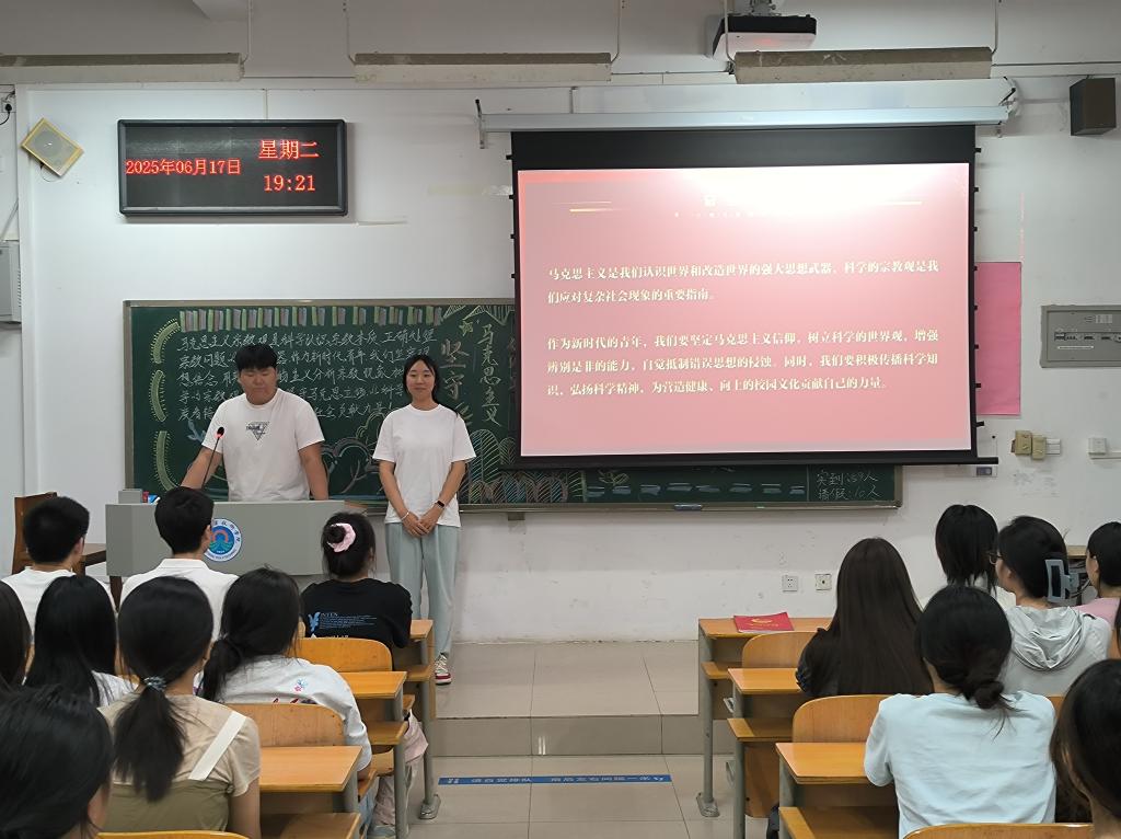 团课在浓厚的学习氛围中拉开帷幕,同学们首先共同观看了《马克思主义宗教观解读》视频,主持人引导大家深入探讨马克思主义的内涵与价值。随后,团课紧密结合马克思主义理论,引入大量生动实际的案例,对社会上常见的宗教现象进行深入剖析,生动阐释了马克思主义立场在认识世界、改造世界过程中的关键作用,让同学们清晰认识到宗教与科学、信仰与理性之间的界限。
